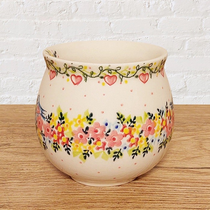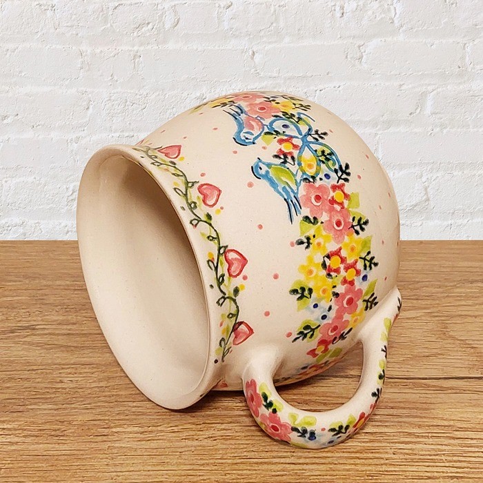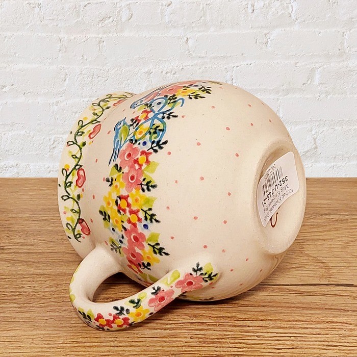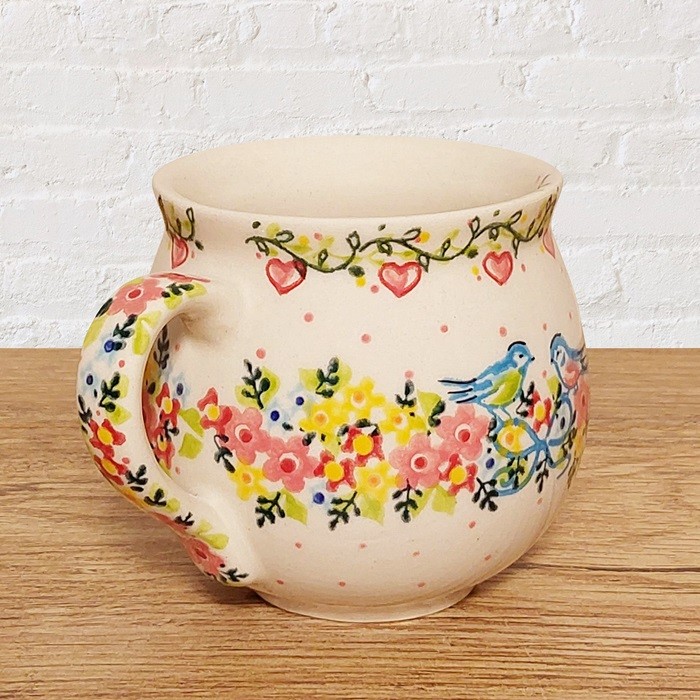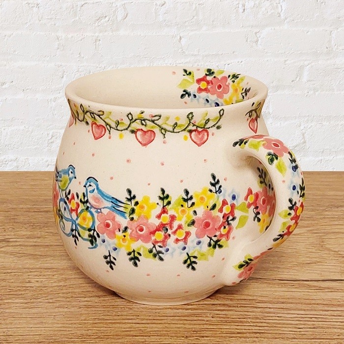 このマグカップは、ポーランド陶器ならではの温かみを感じさせる、ぽってりとした丸いフォルムが特徴です。