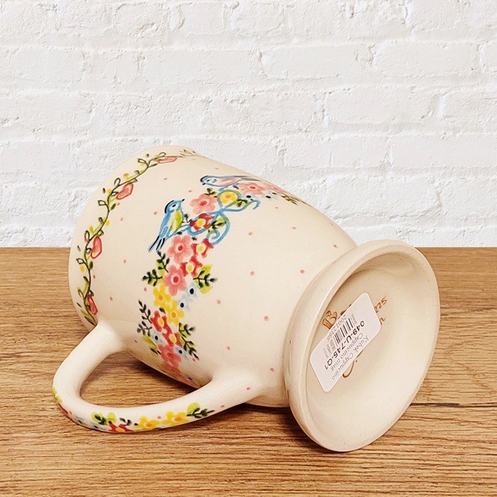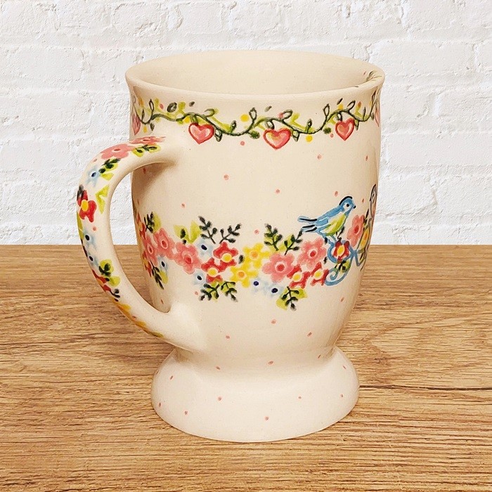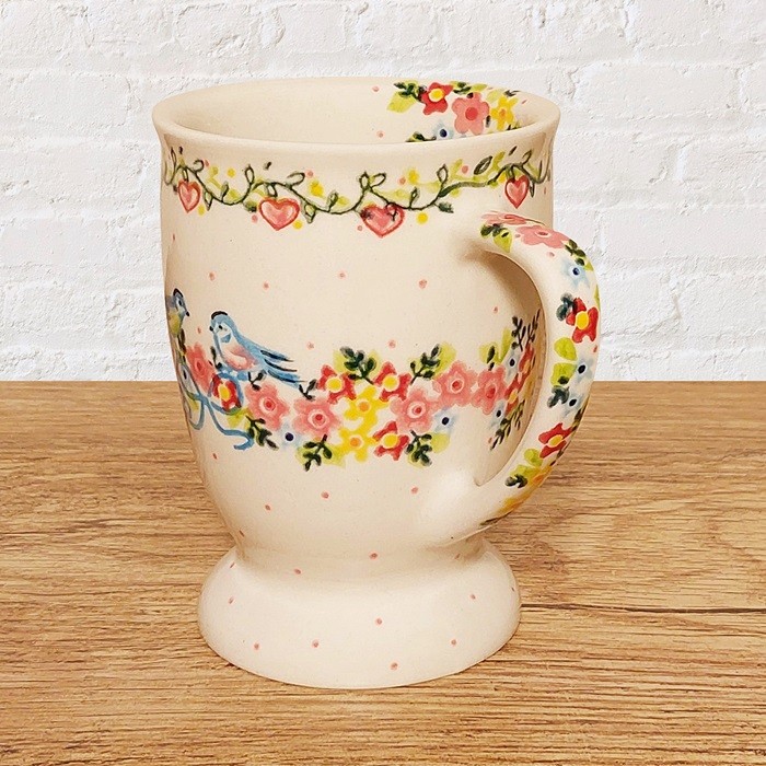 花と小鳥の愛らしい絵柄が施され、毎日のティータイムやコーヒーブレイクを華やかに彩ります。