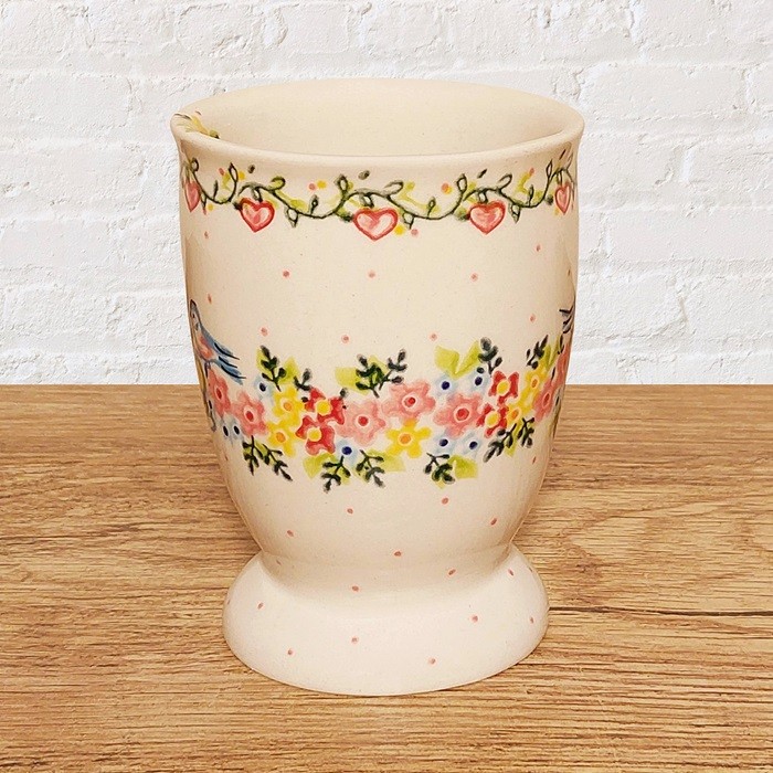 口元がわずかに広がったクラシックなシルエットで、安定感のある台座と持ちやすいハンドルが特徴です。